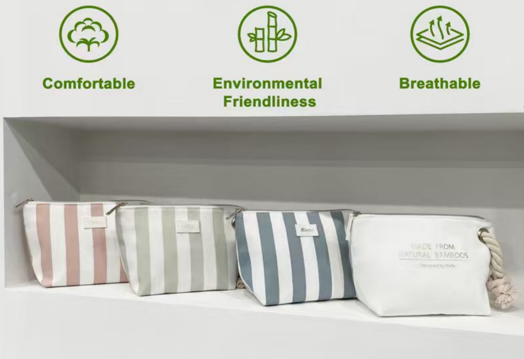 Rivta leverages bamboo's unique properties to create makeup pouches that are not only eco-friendly but also align with the high-quality standards of global brands. By combining bamboo with other sustainable materials like recycled polyester (RPET) or organic cotton, Rivta offers a range of textures and finishes that cater to diverse brand aesthetics.