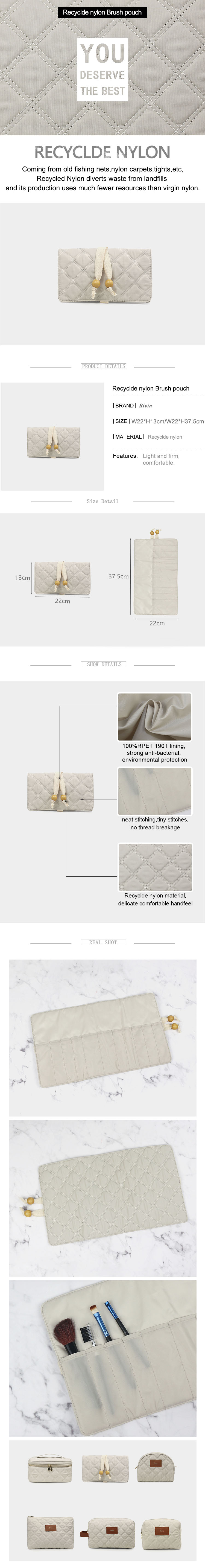 This makeup brush bag is made of Recycled Nylon, which hold your essential cosmetics tools so you can get ready in style.