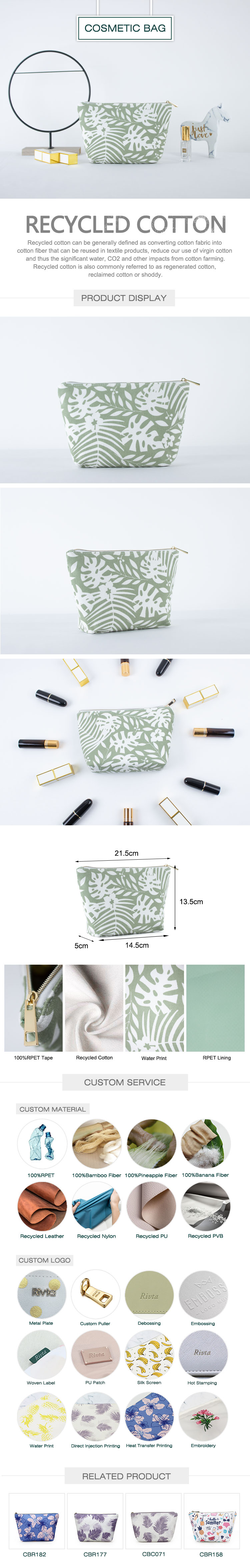 Lining: 190T RPET Lining (Light Green) Hardware: Nylon Zipper (Gold), Metal Puller (Gold) Printing: Water printing (Green)